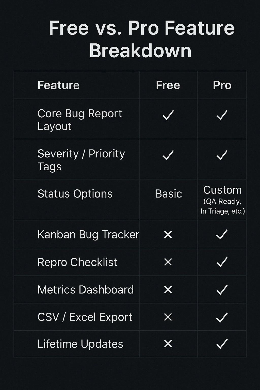 The Pro Edition builds on the free template and adds features to streamline triage, track metrics, and present bugs like a boss.